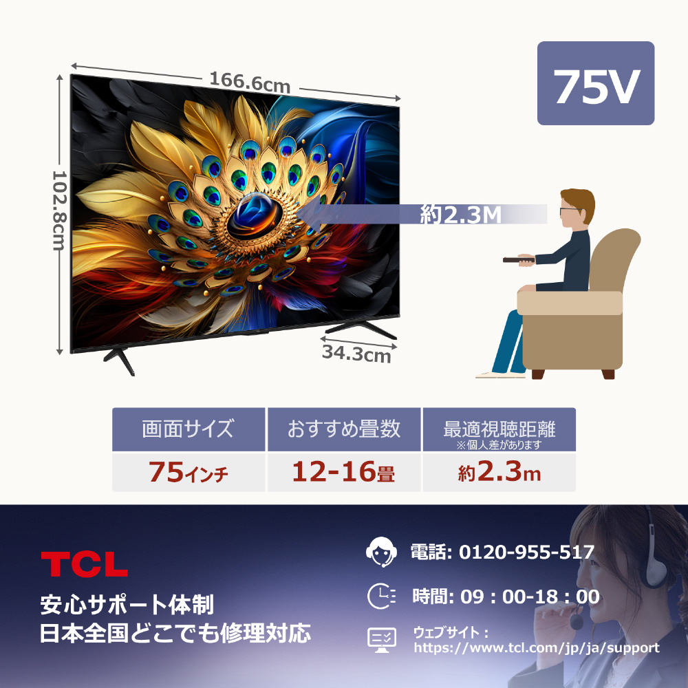 TCL(ティーシーエル) 量子ドット4K液晶テレビ 75C655 [75V型 /Bluetooth対応 /4K対応 /BS・CS 4Kチューナー内蔵 /YouTube対応]