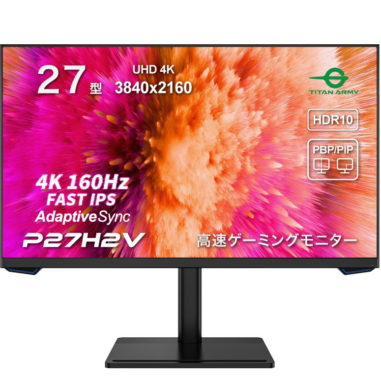 P27H2Vは、4K(3840×2160)の高解像度と160Hzのリフレッシュレートに対応する高速ゲーミングモニターです。HDMI 2.1端子を2つ備え、ゲーミングPCはもちろんPS5などのゲーム機でも4K@120Hz表示による高画質で滑らかなゲームプレイを楽しめます。チルトによる角度調整に加え105mmの上下昇降が可能です。