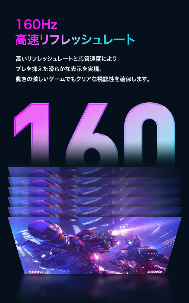 160Hzの高リフレッシュレートで、滑らかな映像を実現。動きの速いシーンでもブレを最小限に抑え、一瞬の判断が鍵となるゲームプレイにおいて反応性を高めます。