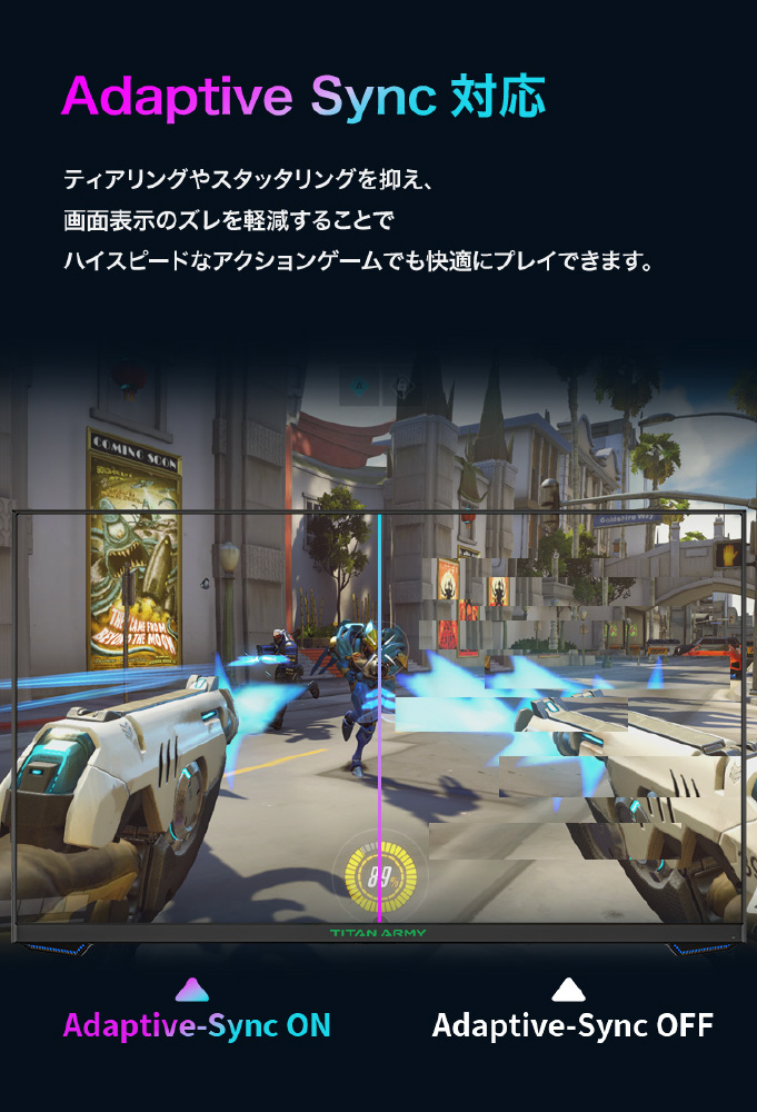 GPUとの連携により、画面のちらつきやティアリングを軽減。滑らかな映像を提供し、プレイの没入感を高めます。