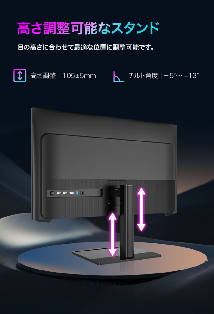 チルト調整や上下昇降機能を備え、快適な視野角を確保。作業やゲームプレイ中の姿勢を自在に調整できます。
