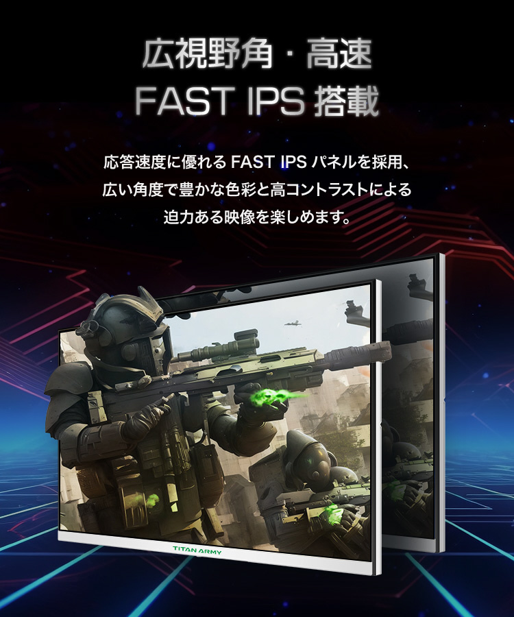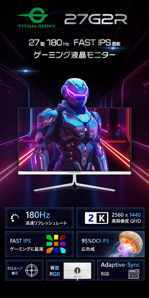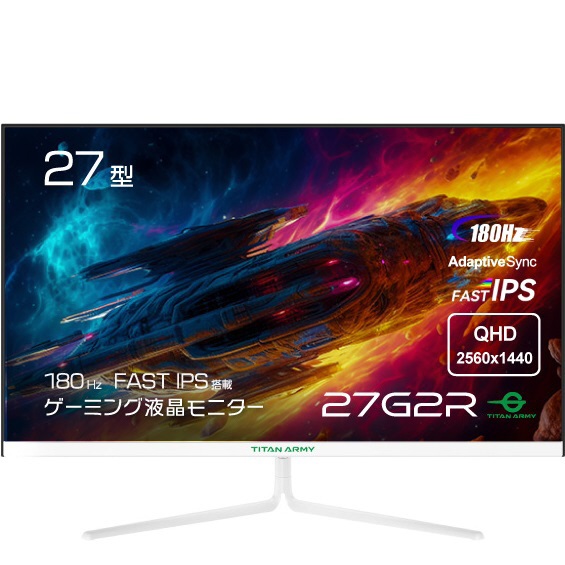Titan Army 27G2RはQHD(2560×1440)、180Hzに対応したバリューモデルの大画面ゲーミングモニターです。ホワイトの筐体と極薄ベゼルは置き場所を選ばず、背面に搭載されたRGB LEDによるイルミネーションでデスク環境を彩ります。低遅延かつ視野角の幅広いFAST IPSを採用、初めてのゲーミングモニターとして最適です。