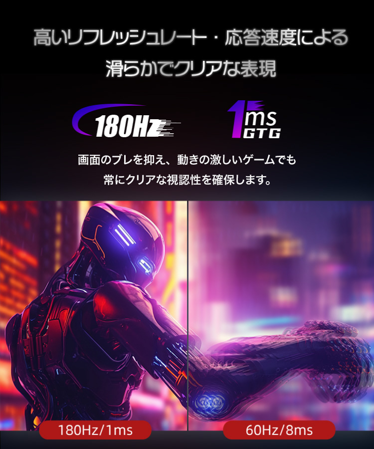 180Hzの高リフレッシュレートで、滑らかな映像を実現。動きの速いシーンでもブレを最小限に抑え、プレイの精度を高めます。