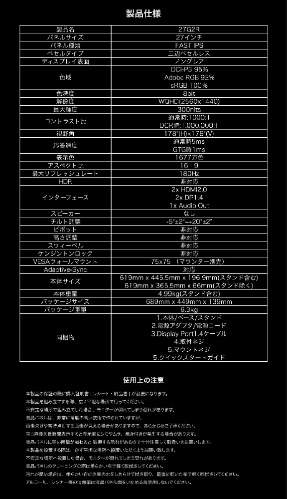| 付属品 | [同梱物] 1.本体/ベース/スタンド 2.電源アダプタ/電源コード 3.Display Port1.4ケーブル 4.取付ネジ 5.マウントネジ 5.クイックスタートガイド |