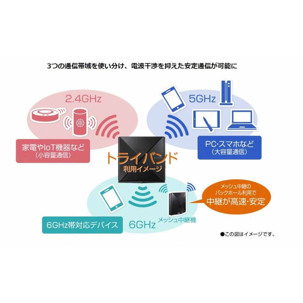 ・最大2402Mbps(6GHz帯)+2402Mbps(5GHz帯)+574Mbps(2.4GHz帯)の高速通信