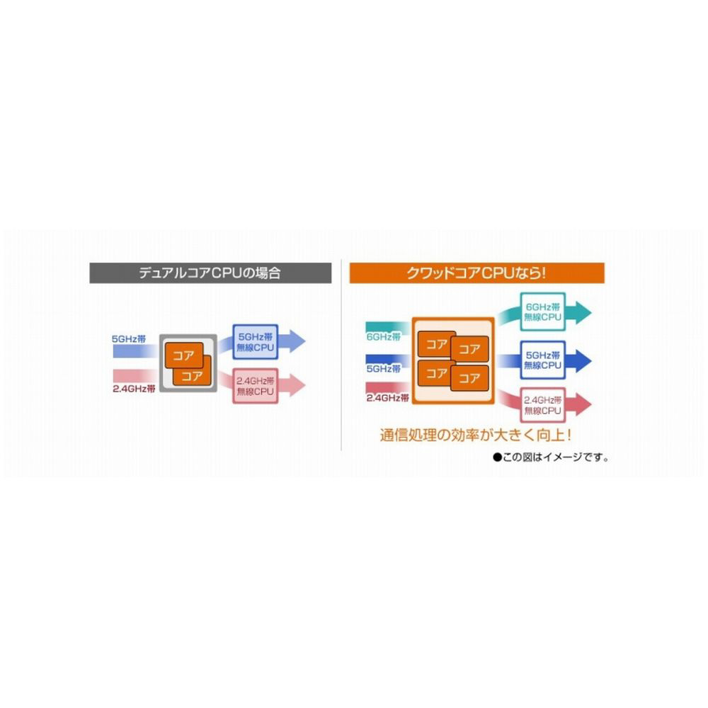 4つのコアを持つクアッドコアCPUを搭載。これにより6GHz帯/5GHz帯/2.4GHz帯の電波を同時に利用した場合でも4コアによる効率的な並行処理によって高速通信を実現します。