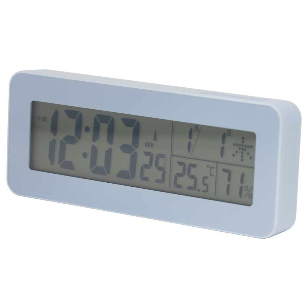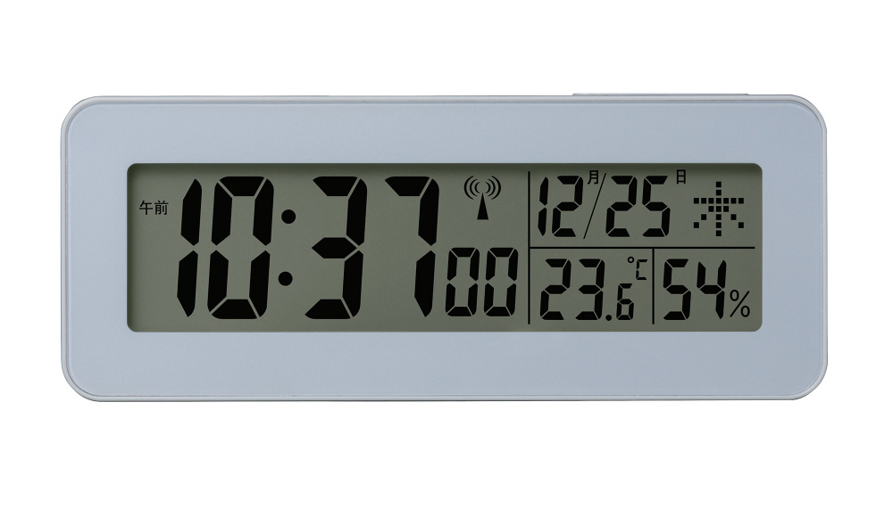 お部屋に馴染みやすいグレイッシュカラーの電波デジタル時計です