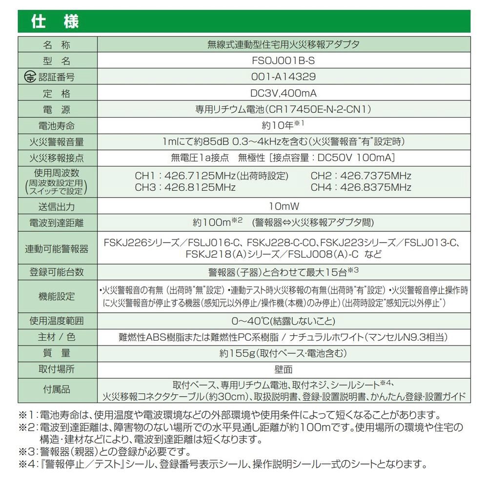 | 商品名 | 無線式連動型 住宅用火災移報アダプタ FSOJ001B-S |