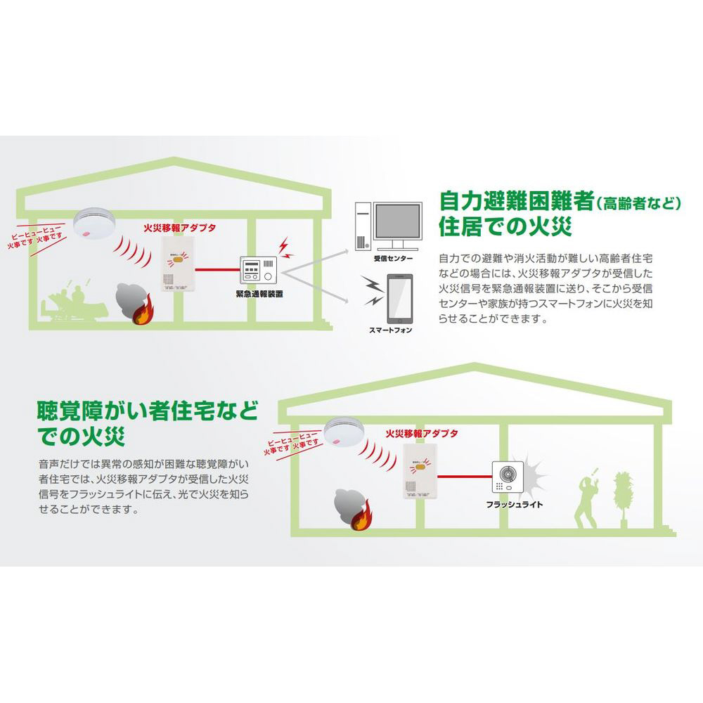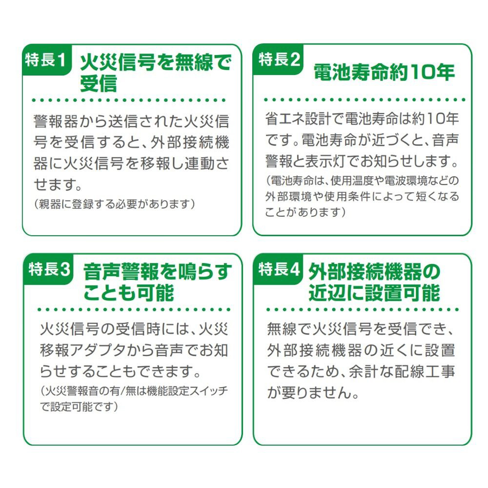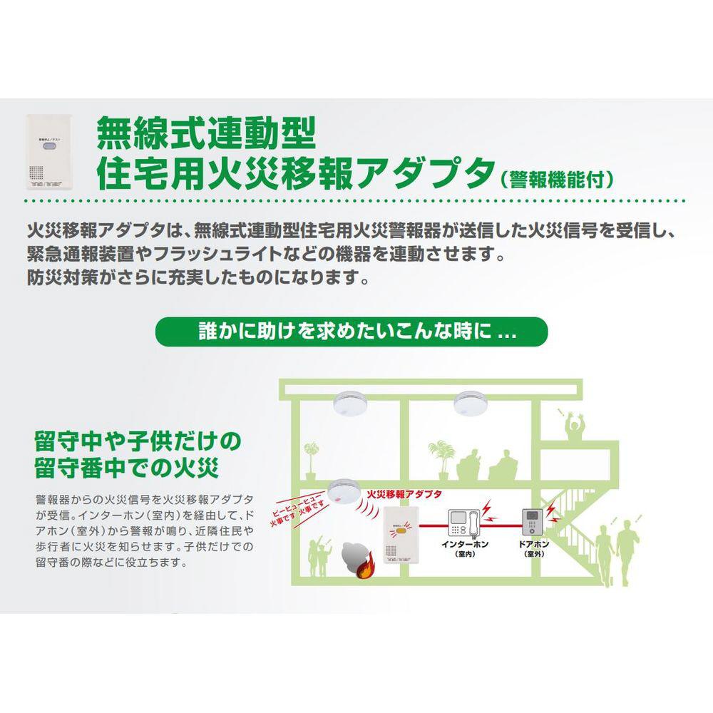 ●無線式連動型住宅用火災警報器が火災を感知すると、無線で連動して移報を出力する無線式連動型住宅用火災移報アダプタです。