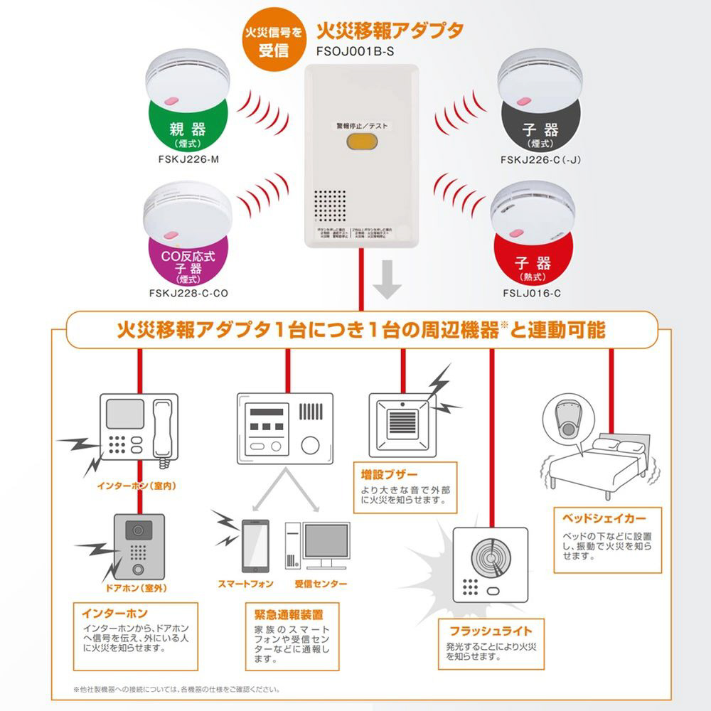 ●連動可能警報器:FSKJ226シリーズ/FSLJ016-C、FSKJ228-C-CO、FSKJ223シリーズ/FSLJ013-C、FSKJ218(A)シリーズ/FSLJ008(A)-Cなど