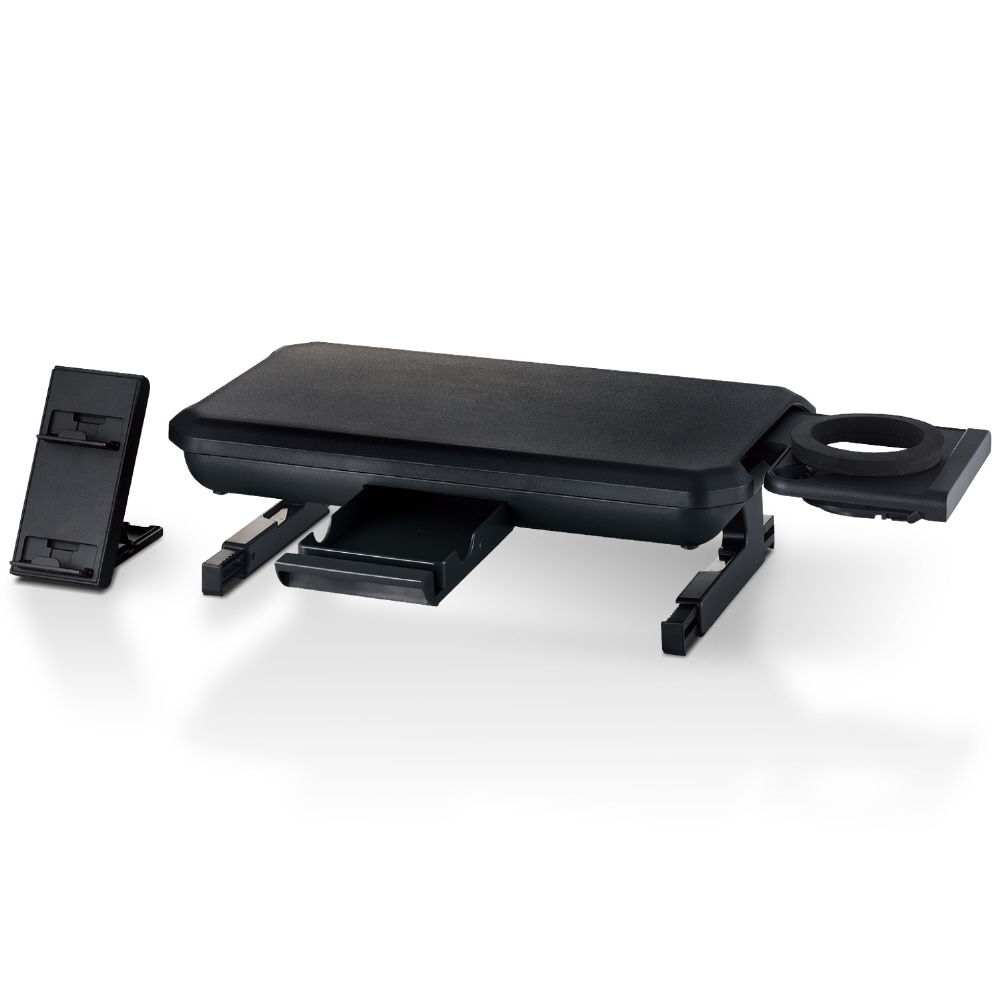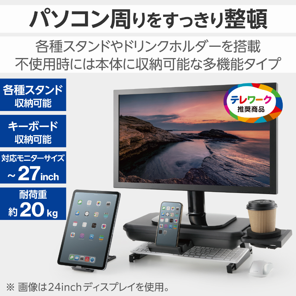 パソコン周りをすっきり整頓!高さ2段階に調節可能な多機能モニタースタンドです。モニタースタンドの下にキーボードを置くなどスペースを有効活用できるので、デスクを広く使えます。ドリンクホルダーとスマホスタンド付きなので、必要なものを手に取りやすい位置に置きながら作業ができます。