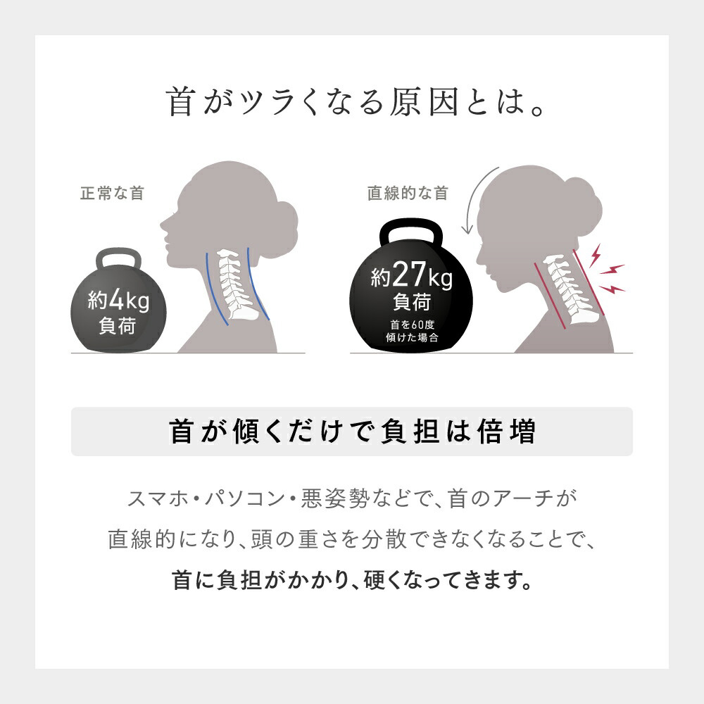 固まりがちな首を自然なアーチ状へとサポートすることで、首への負担を軽減し首まわりをラクにします。