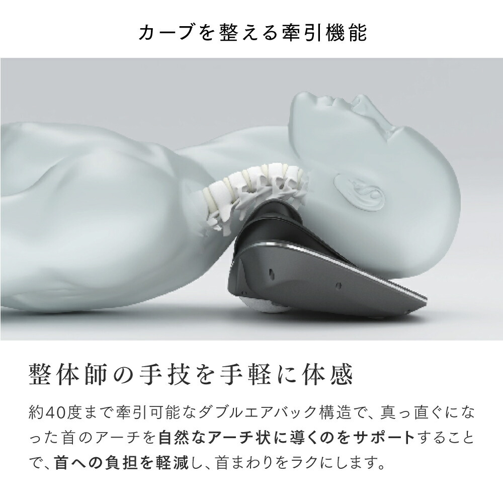温熱やEMSではケアできない骨へアプローチ。約40度の角度まで牽引可能なダブルエアバック構造で、まるで整体で受ける施術のように首をやさしく上に持ち上げたり、引っ張ったりする体感を再現しました。