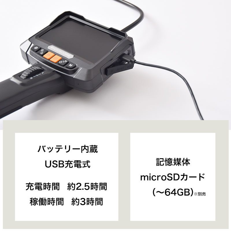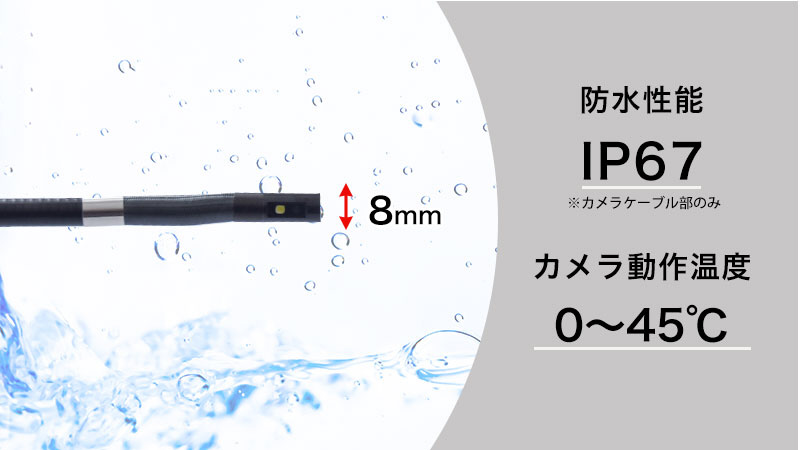 | 仕様3 | 【湾曲角】約210度【防水性能】IP67(カメラケーブル部のみ) |