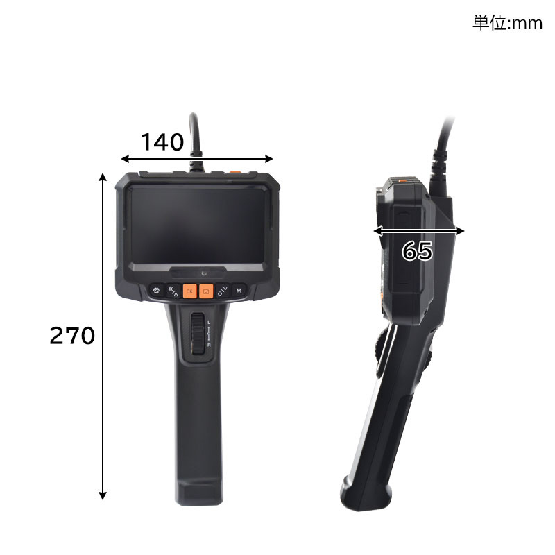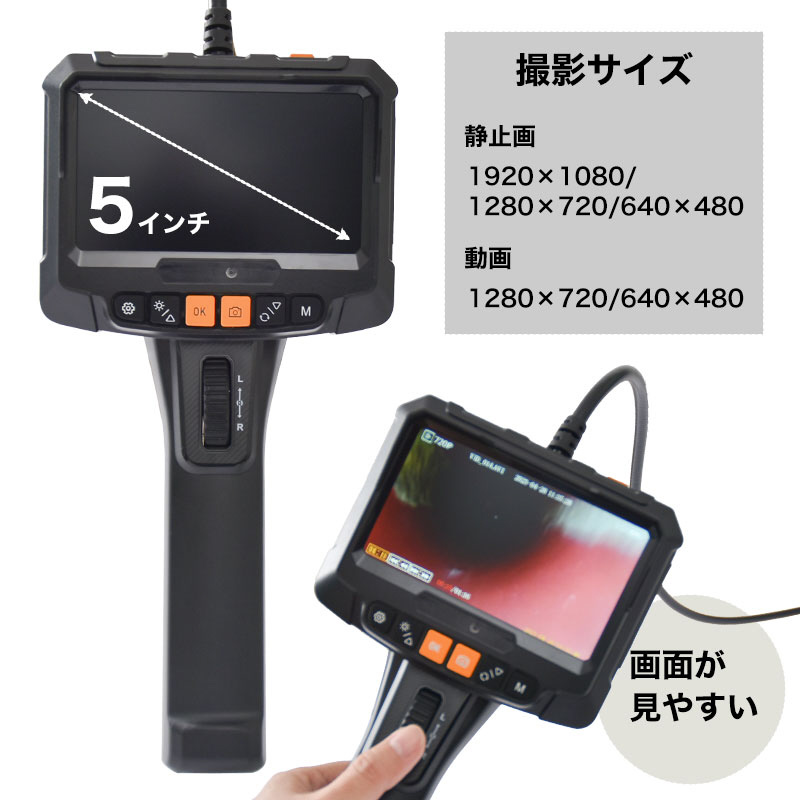 側視カメラ付先端可動内視鏡は5インチの大型ディスプレイを採用しています。