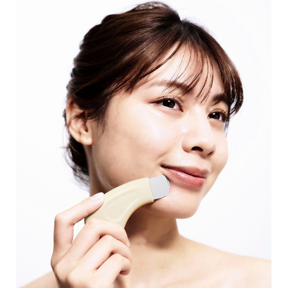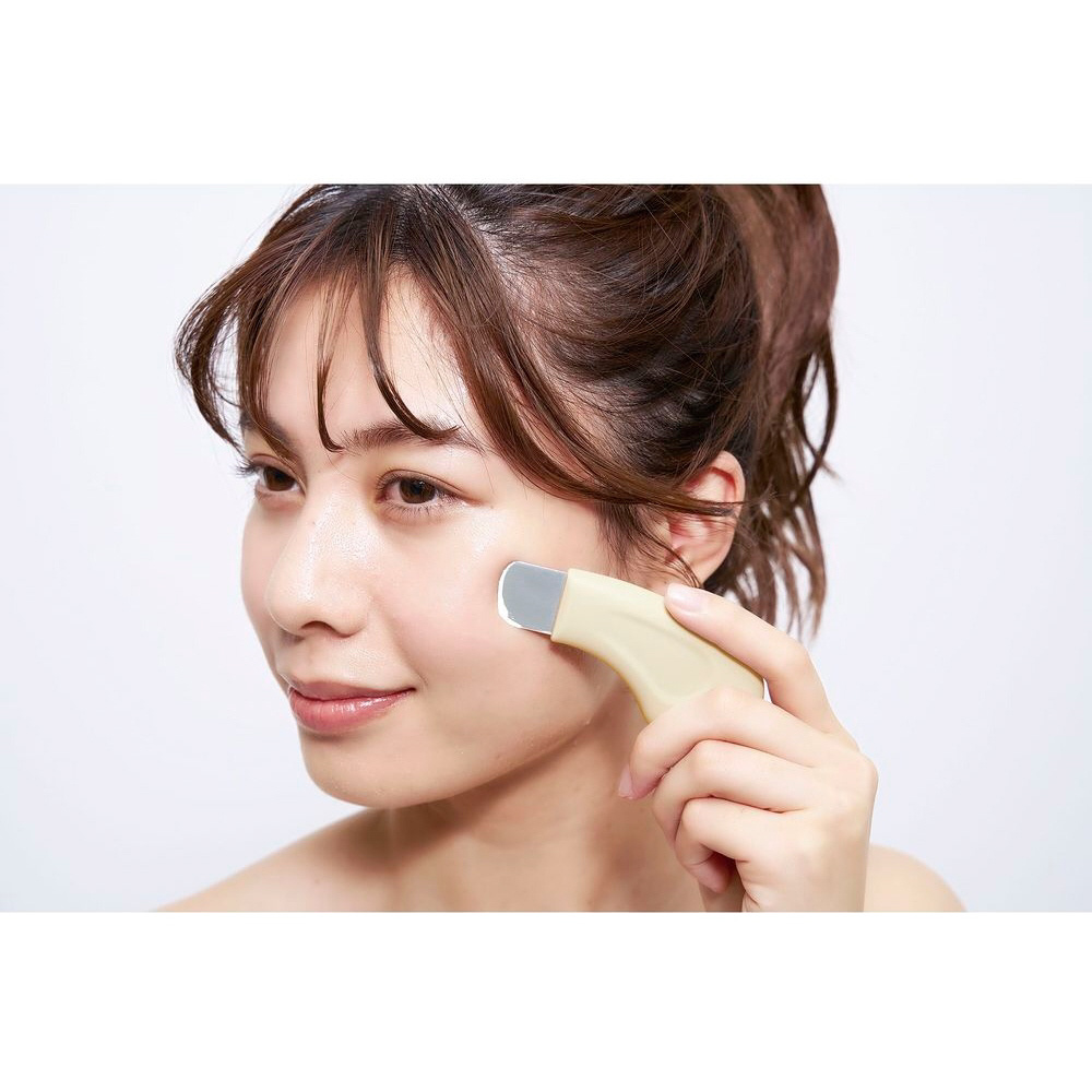 (1) クレンジングオイルや洗顔で顔の汚れをオフした後の濡れた状態の 肌に、本品スパチュラ部を立て、優しく押し当てる。