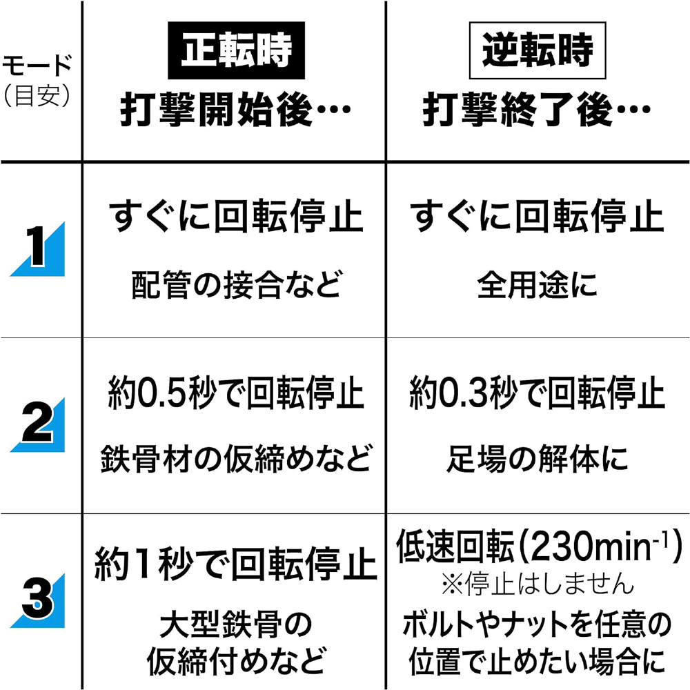 打撃後約0.5秒、約1秒等で停止し、連続した仮締め作業から、緩め作業時のナット脱落防止に便利。