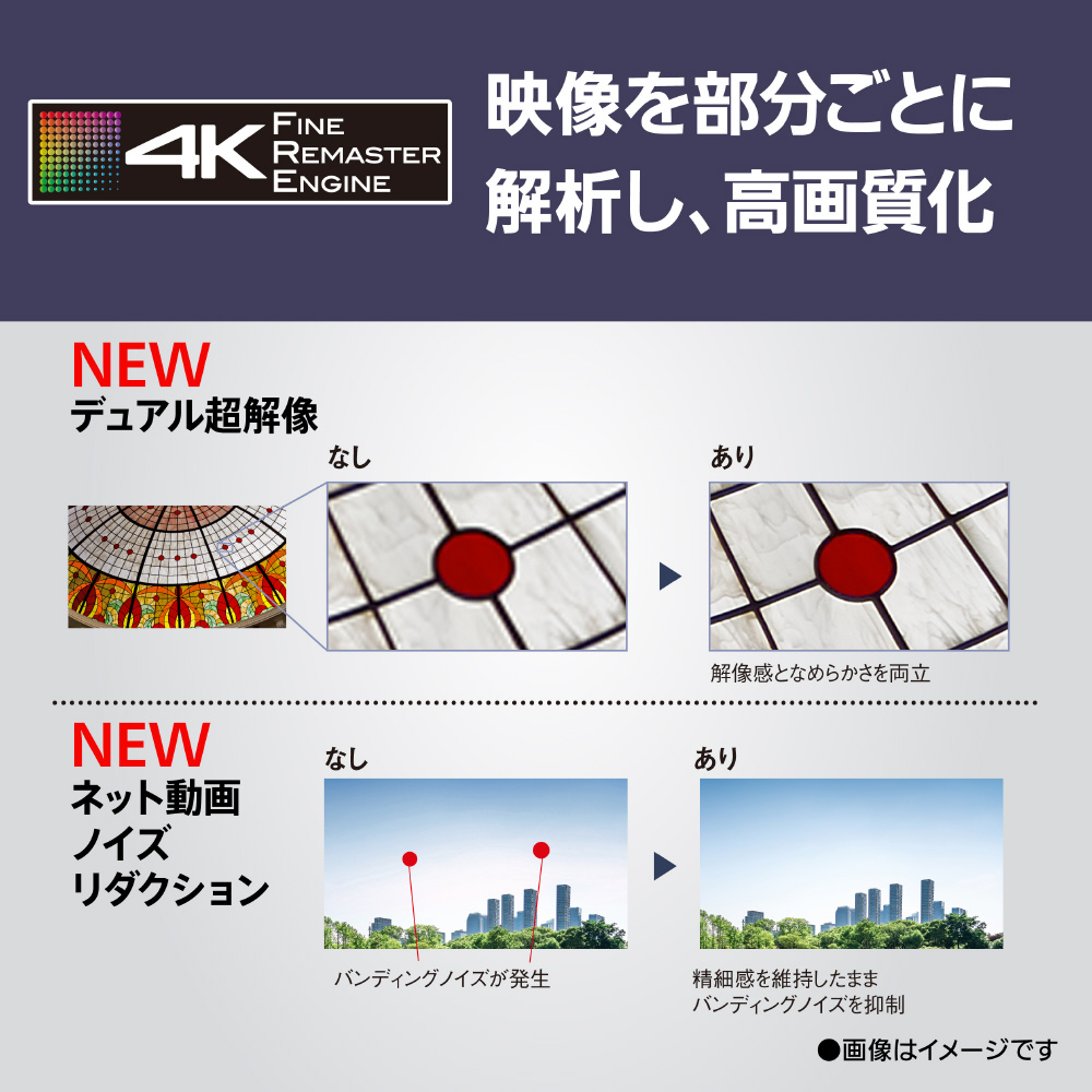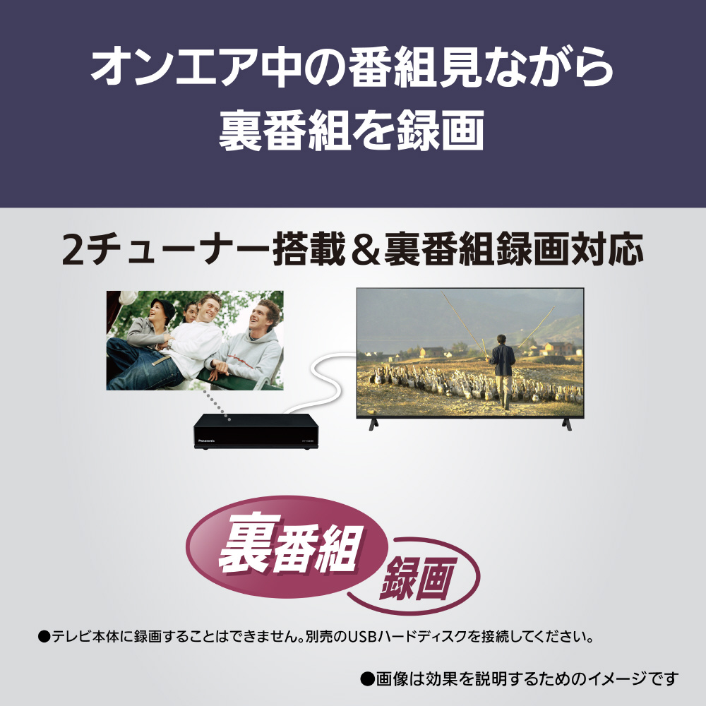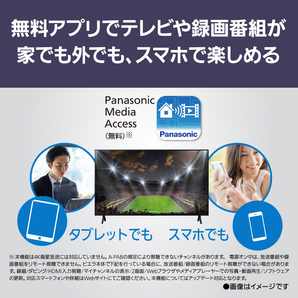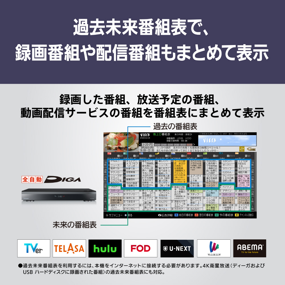 4K衛星放送録画(USBハードディスク使用時)、過去未来番組表(ディーガ連携)、お部屋ジャンプリンク※1、Panasonic Media Access、LANダビング※2の機能は、2024年内を目途にアップデート対応となります。