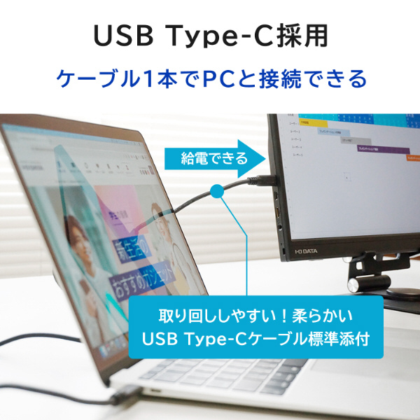 USB Type-Cディスプレイ給電に対応しているので、添付しているUSB Type-Cケーブルで接続することにより、パソコンからの映像出力と給電がケーブル1本で行われます。