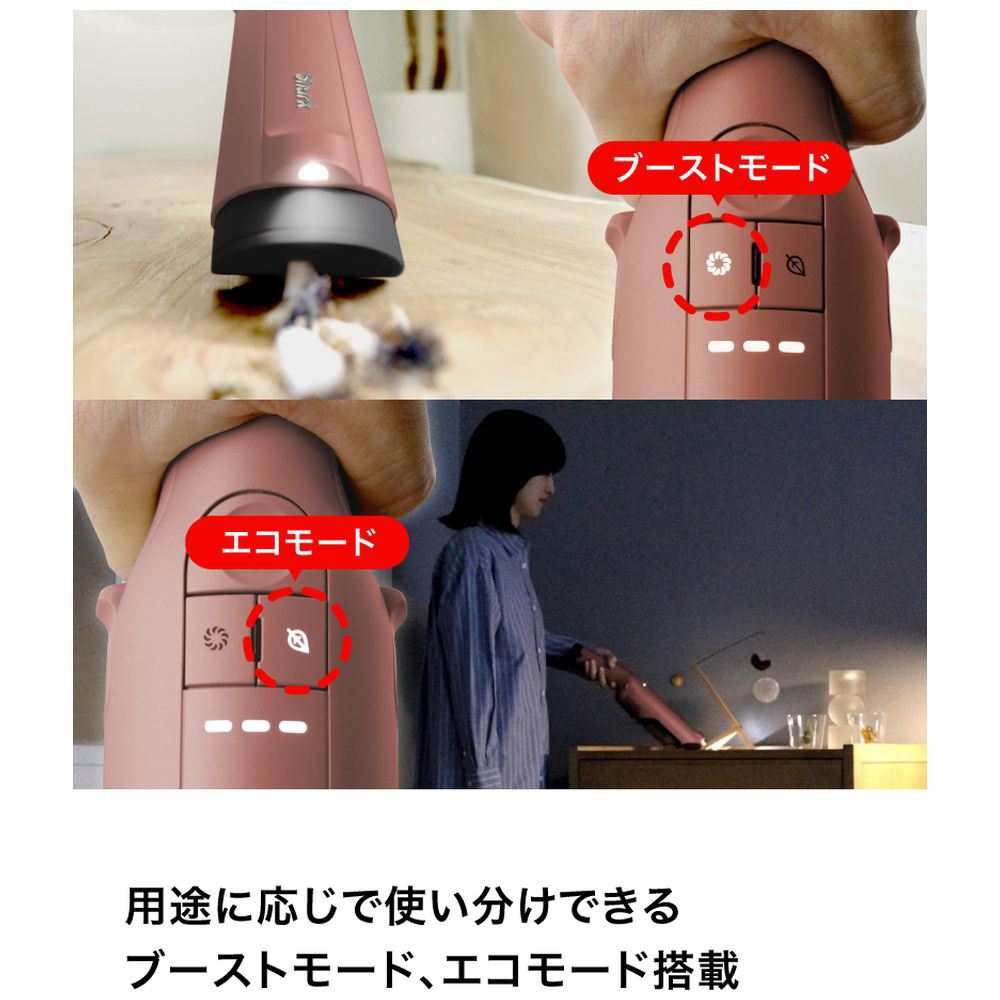 より吸引力のあるブーストモード、より作動音の少ないエコモードを搭載し、シーンにあわせた使い分けで用途が広がる。
