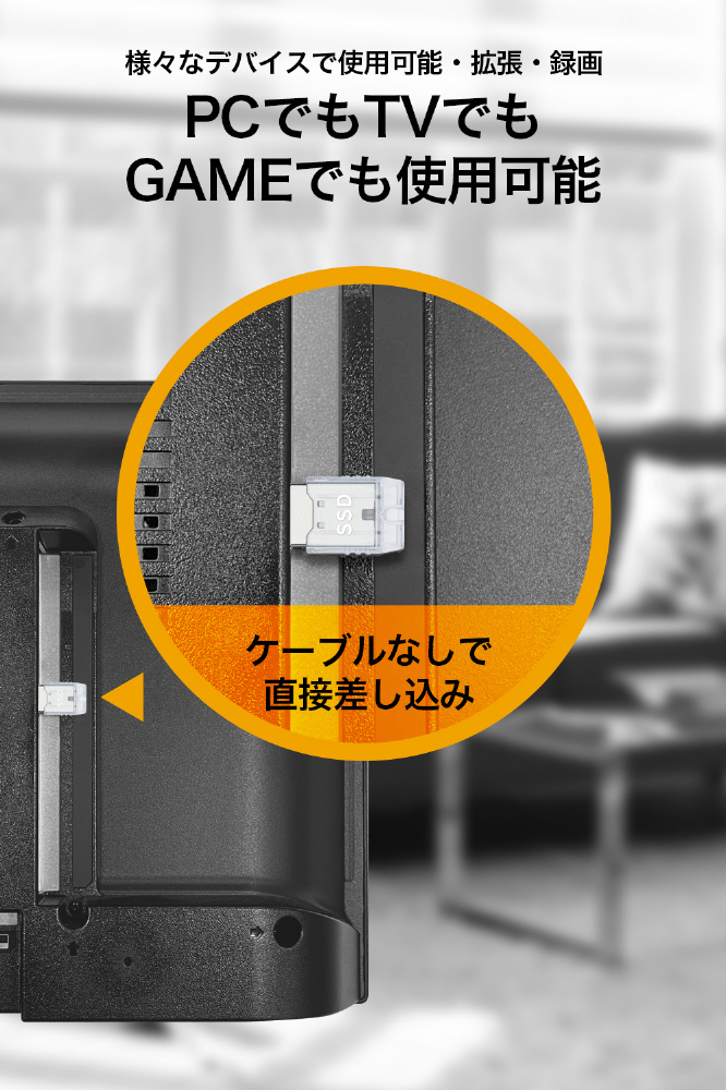 PC/TV録画に対応した、USB3.2(Gen2)対応のSSD。飛び出し部分は約18mmの小型サイズで、壁掛け対応TVでも壁に接触しません。