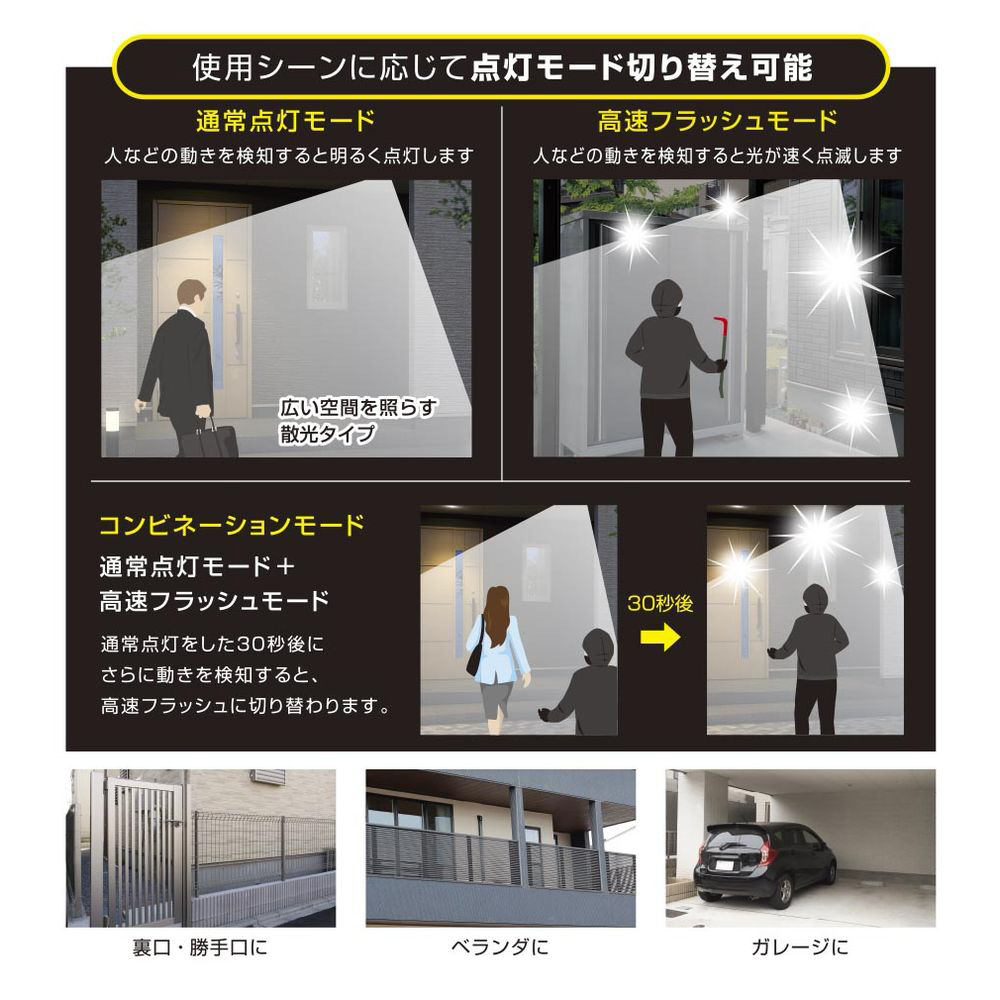 ・コンビネーションモード(通常点灯モード+高速フラッシュモード)…通常点灯をした30秒後にさらに動きを検知すると、高速フラッシュに切り替わります。