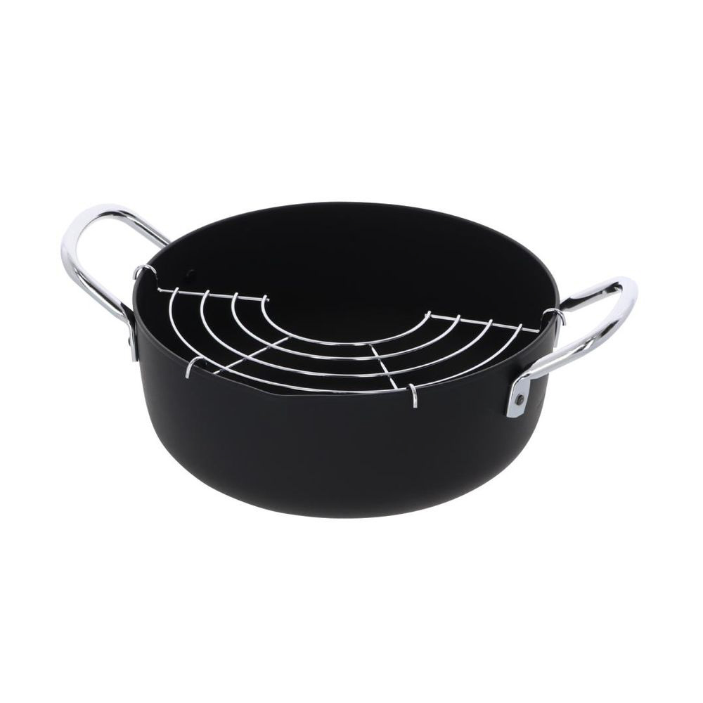 ●材料の種類/本体: 鉄(底の厚さ0.9mm) 取っ手・アミ: 鉄 ●表面加工/本体: シリコン樹脂塗装 取っ手・アミ: クロムメッキ ●寸法/20cm ●適正油量: 1.0L ●満水容量/2.2L