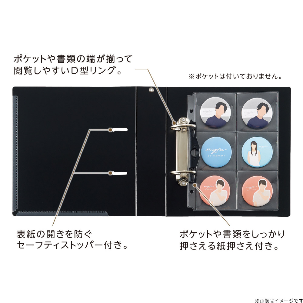 お気に入りのコレクションをまとめて保管できるファイル。ポケットや書類の端が揃って閲覧しやすいD型リング。表紙の開きを防ぐセーフティストッパー付き。ポケットや書類をしっかり押さえる紙押さえ付き。A5クリヤーホルダーが入る表紙ポケット。ラベリングやデコレーションができる背見出し紙付き。キーホルダーが付けられるストラップホール(A5サイズのみ)。A5 サイズは持ち運びに最適。※ポケットは付いておりません。