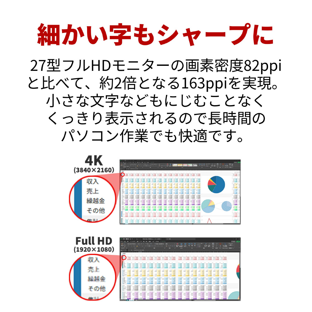 27型フルHDモニターの画素密度82ppi(pixel per inch)と比べて、約2倍となる163ppiを実現。これにより、小さな文字などもにじむことなくくっきり表示されるので、長時間のパソコン作業でも快適です。