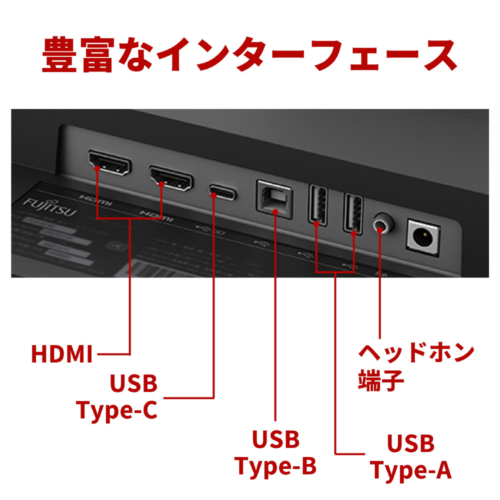映像・音声入力、データ転送、接続機器の充電(最大65W)が同時にできるUSB Type-C端子を搭載。接続しているパソコンに別途電源供給の必要がなく配線がスッキリ。パソコンの移動・持ち出しも非常に手軽になります。