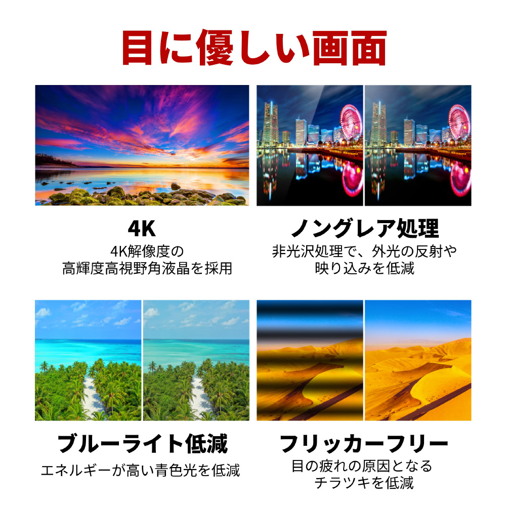 フルHDの4倍の表示エリアの4K UHD(3840×2160pixel)に対応。映像の細部までより鮮明に表示できます。より多くの情報を一度に表示し、快適な作業を行うことができます。