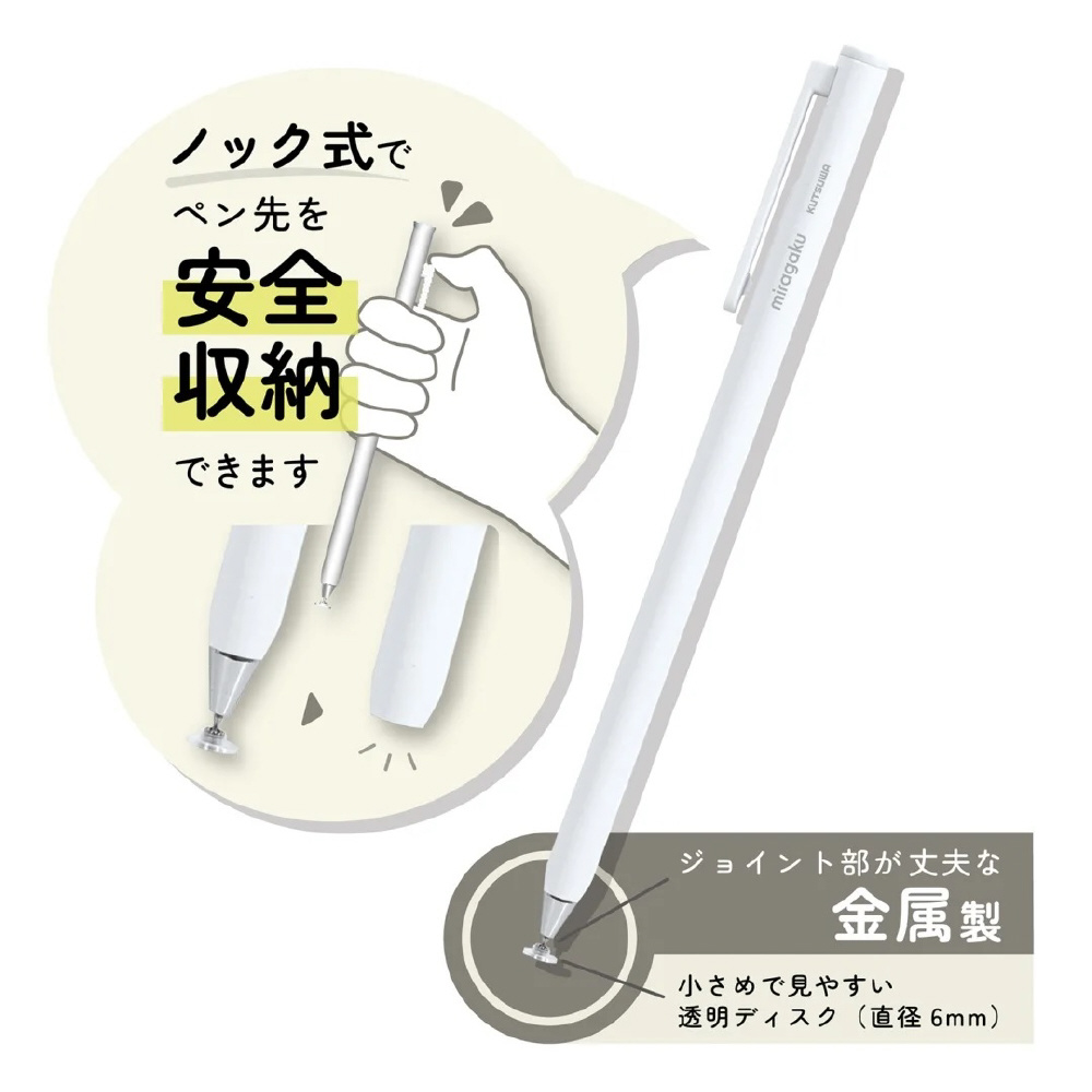 | 仕様1 | [本体サイズ]H152×W13×D9mm [重量]13g [材質] ペン軸:アルミニウム、磁石 クリップ:ABS ディスク型ペン先:ABS、PET、銅 |