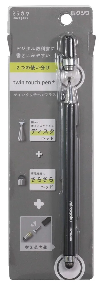 デジタル教科書に書きこみやすい透明ディスクヘッドと、導電繊維のさらさらヘッドのツインタイプです