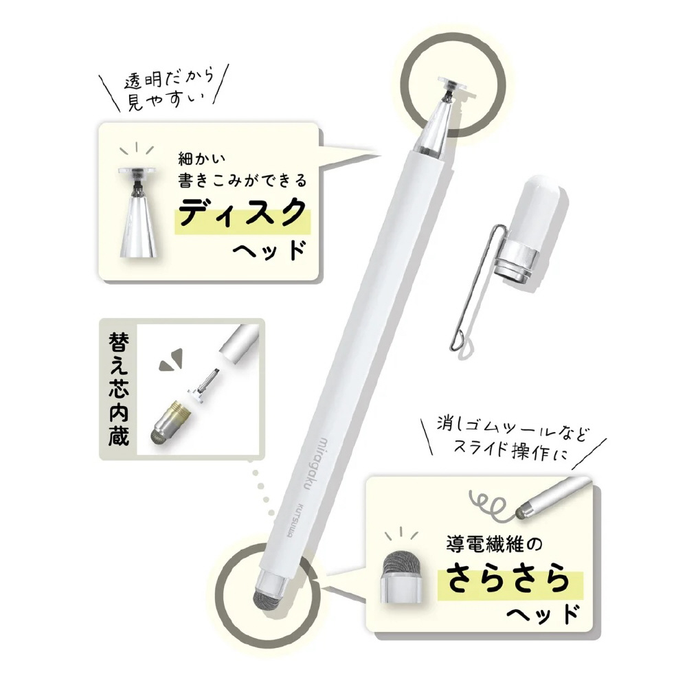 ・デジタル教科書に書きこみやすい透明ディスクヘッドと、導電繊維のさらさらヘッドのツインタイプです