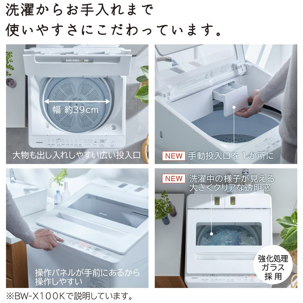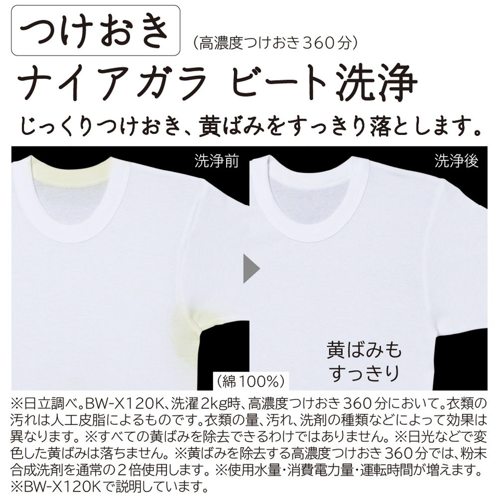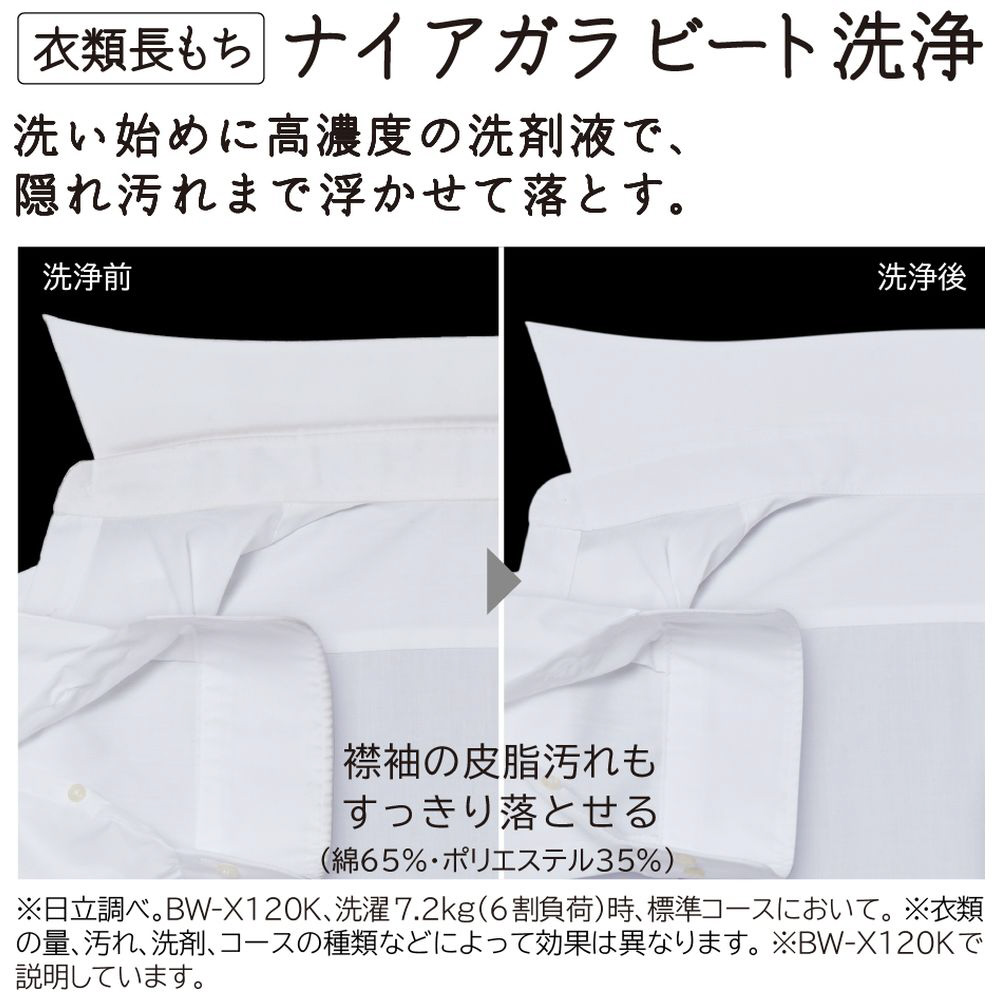 ※日立調べ。2019年モデルBW-X120E(BW-V70Kと同等性能の機種)、洗濯2kg時、高濃度つけおき360分において。衣類の汚れは人工皮脂によるものです。衣類の量、汚れ、洗剤の種類などによって効果は異なります。