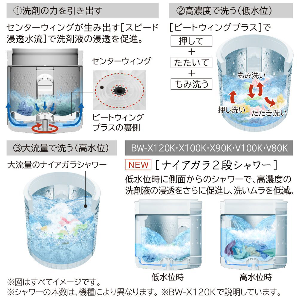 そして、[ナイアガラ2段シャワー]によって低水位時に側面からのシャワーをかけて高濃度の洗剤液の浸透をさらに促進します。