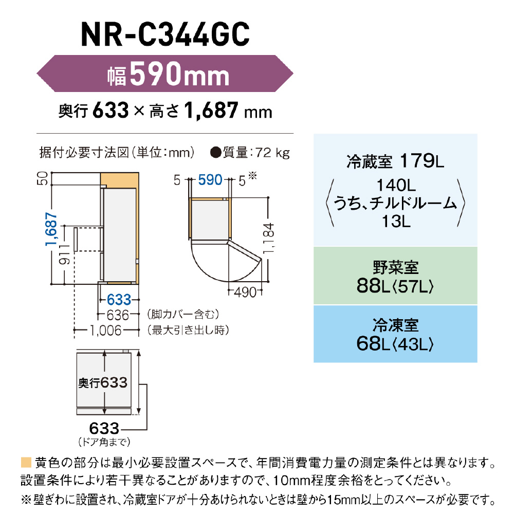 冷蔵庫 GCタイプ ダークブラウン NR-C344GC-T [幅59cm /335L /3ドア /右開きタイプ /2023年]【生産完了品】 【基本設置料金セット】