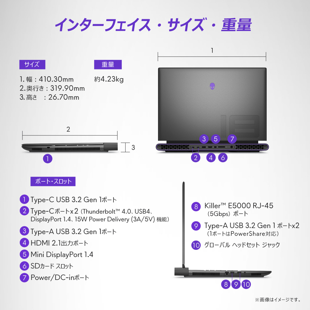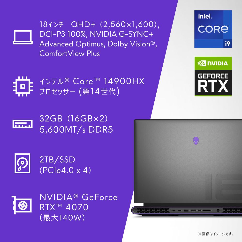 【英語版】最新の第14世代インテル Core i9-HXプロセッサー、NVIDIA GeForce RTX 40シリーズ グラフィックスに加え、さらに進化したAlienware Cryo-tech冷却システムを搭載。最強クラスのプレイを実現する、ハイパワーな18インチ ゲーミング ノートパソコン。