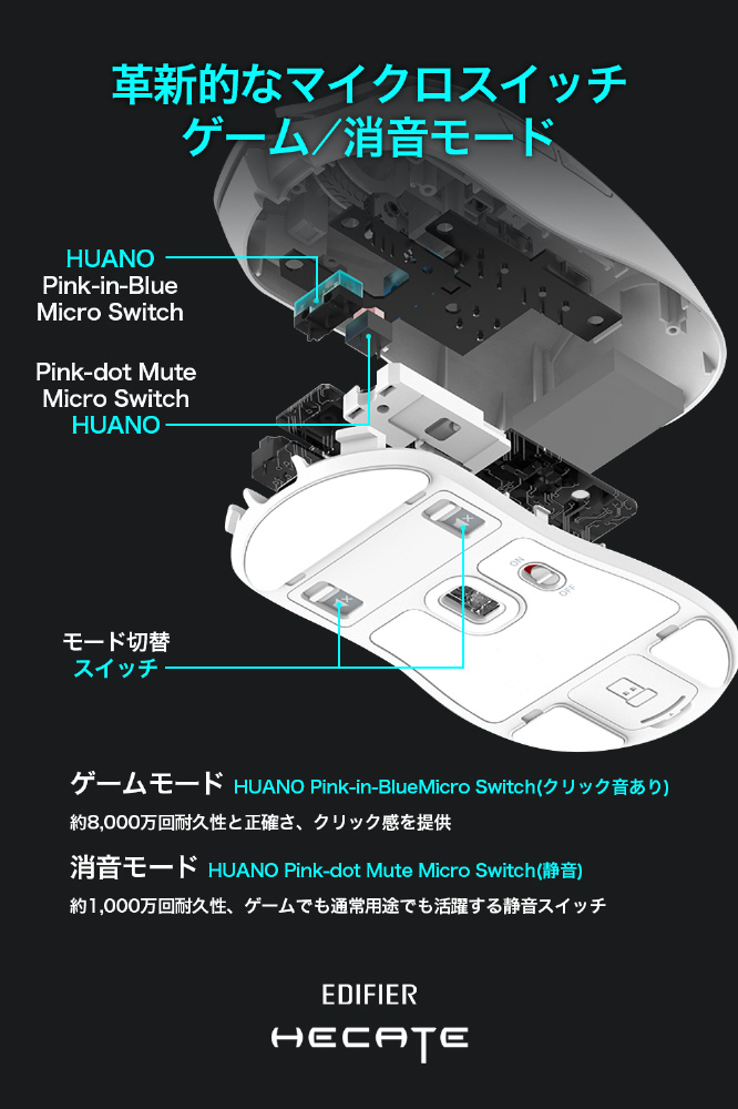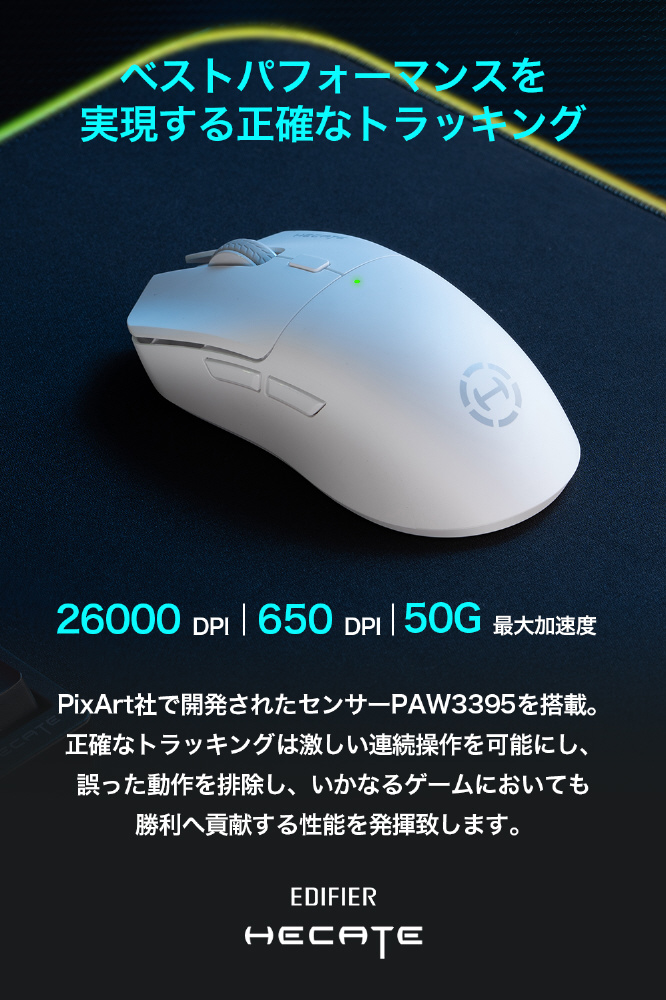 有線/無線/Bluetoothの接続に対応したEdifier社製軽量ゲーミングマウス、低遅延無線接続と静音スイッチへの切替に対応