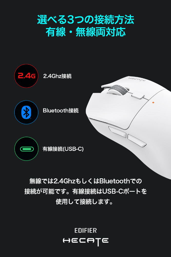 ゲーミングマウス USB-C+USB-A対応 「G3MPRO」HECATE(へケート) ホワイト ED-G3MPRO-WH [光学式 /有線/無線(ワイヤレス) /6ボタン /Bluetooth・USB]