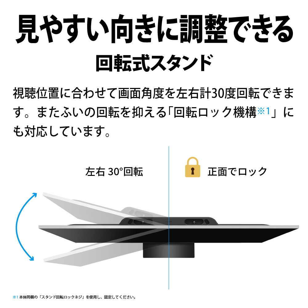 視聴位置に合わせて画面角度を左右計30度回転できます。またふいの回転を抑える「回転ロック機構※1」にも対応しています。