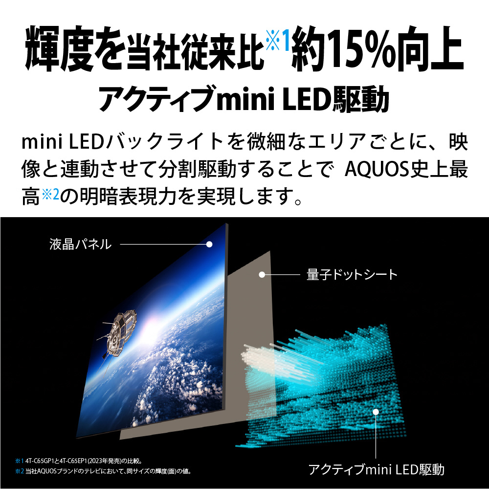 ※2 シャープAQUOSブランドのテレビにおいて、同サイズの輝度(面)の値