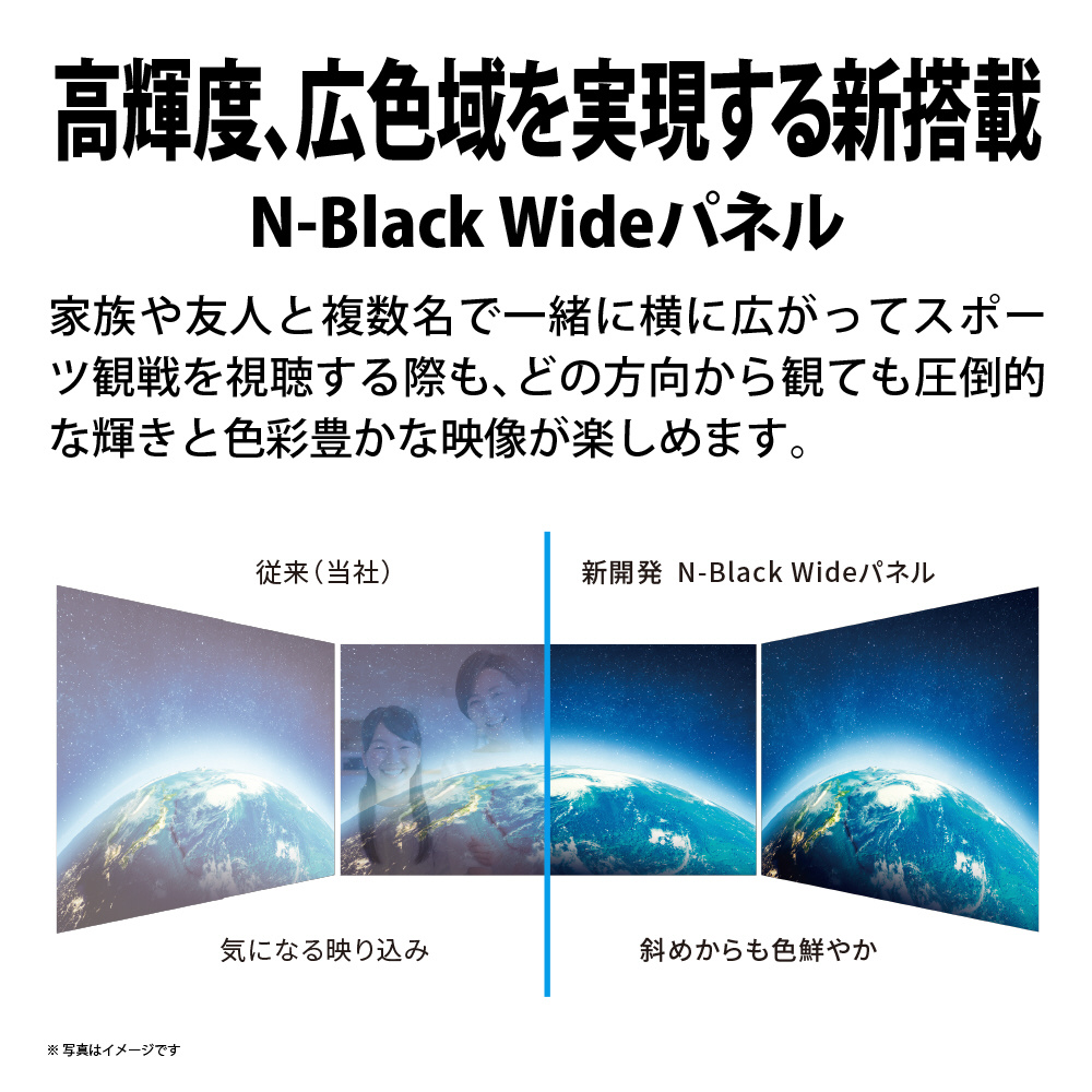 ・量子ドット技術を採用した新開発の「N-Black Wideパネル」が視聴位置による色の変化軽減する事で、斜めから見ても艶やかな黒と鮮やかな色彩を表現