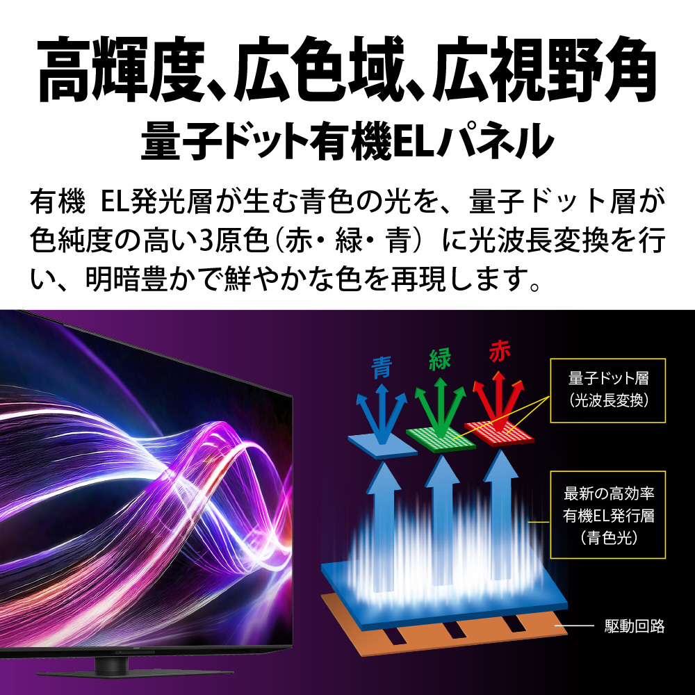 ・高輝度、広色域、広視野角を実現する「量子ドット有機EL(QD-OLED)パネル」を採用。純度の高い3原色を表示する技術により、多彩な色を鮮やかに表現すると共に、広い視野角特性により様々な角度からも美しい映像が楽しめます。