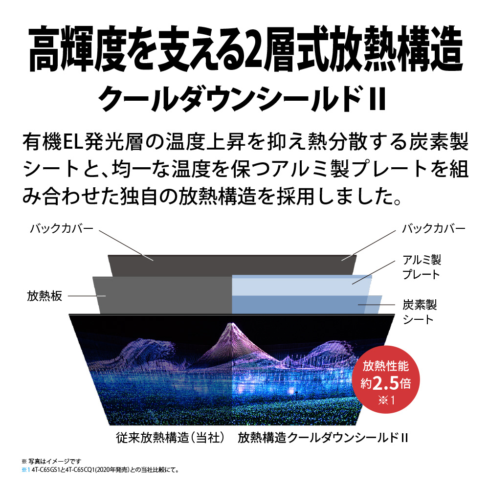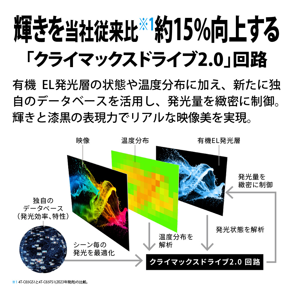 ・発行の妨げになる熱上昇を抑える放熱構造には、炭素性シートとアルミ製プレートの2層構造を採用。さらに、発行量を画素単位で緻密に制御する「クライマックスドライブ2.0」回路を新搭載。有機EL発光層の状態や温度分布に加え、パネル特性に関する当社独自のデータベースも活用し、輝きを当社従来比約15%向上。眩いばかり輝きと漆黒の表現力でリアルな映像美を実現します。