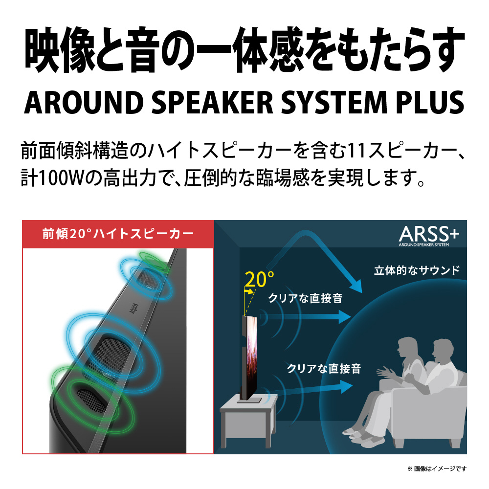 ・映像とシンクロした立体的なサウンドをもたらす「アラウンドスピーカーシステムプラス」を採用。さらに、クリアでパワフルな音を実現する「パワーボイススピーカー」を搭載し、計100Wの高出力を実現しました。加えて、ハイトスピーカーを保護する金属製パンチングネットの開口率を上げ、よりクリアで広がり感のある音を響かせます。映像と音声の一体感を生み出し、包み込まれるような音響空間を体感できます。