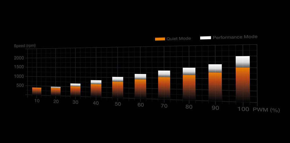 135mmファン2基による強力なエアフローはスイッチで簡単モード切り替え可能。専用設計のファンとカバーでマッシブな外観。