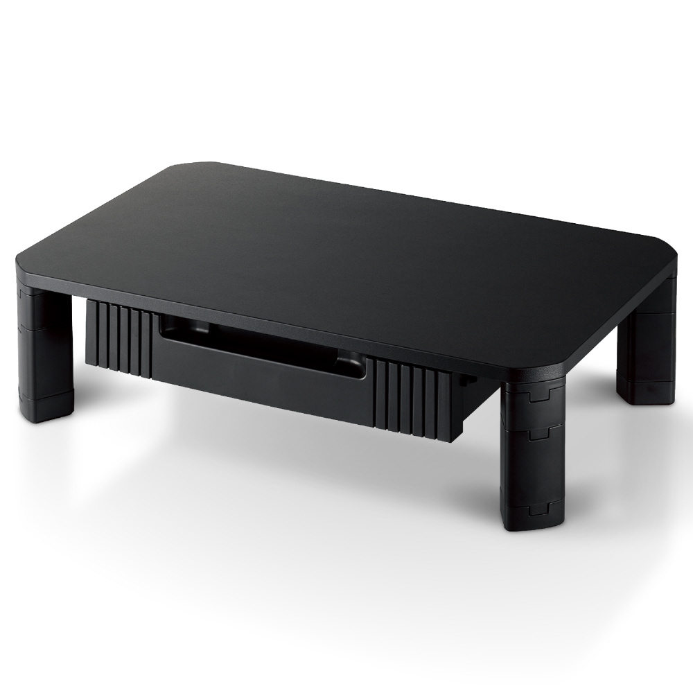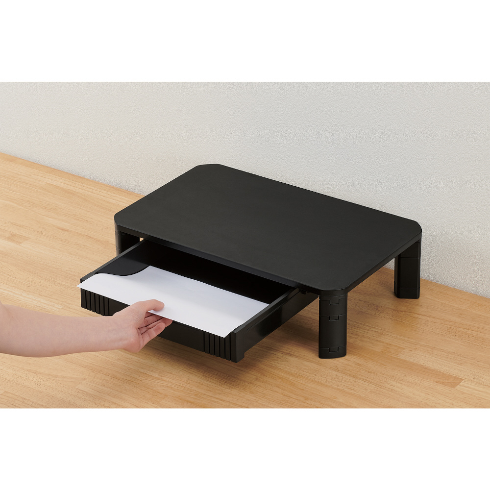 モニターの高さを上げ、目線を上げることでパソコン作業時の姿勢を改善することができるモニタースタンドです。脚パーツを組み合わせて3段階に高さ調節が可能。A4サイズの紙などが入る引き出し付きで、デスク上の整理にも便利です。