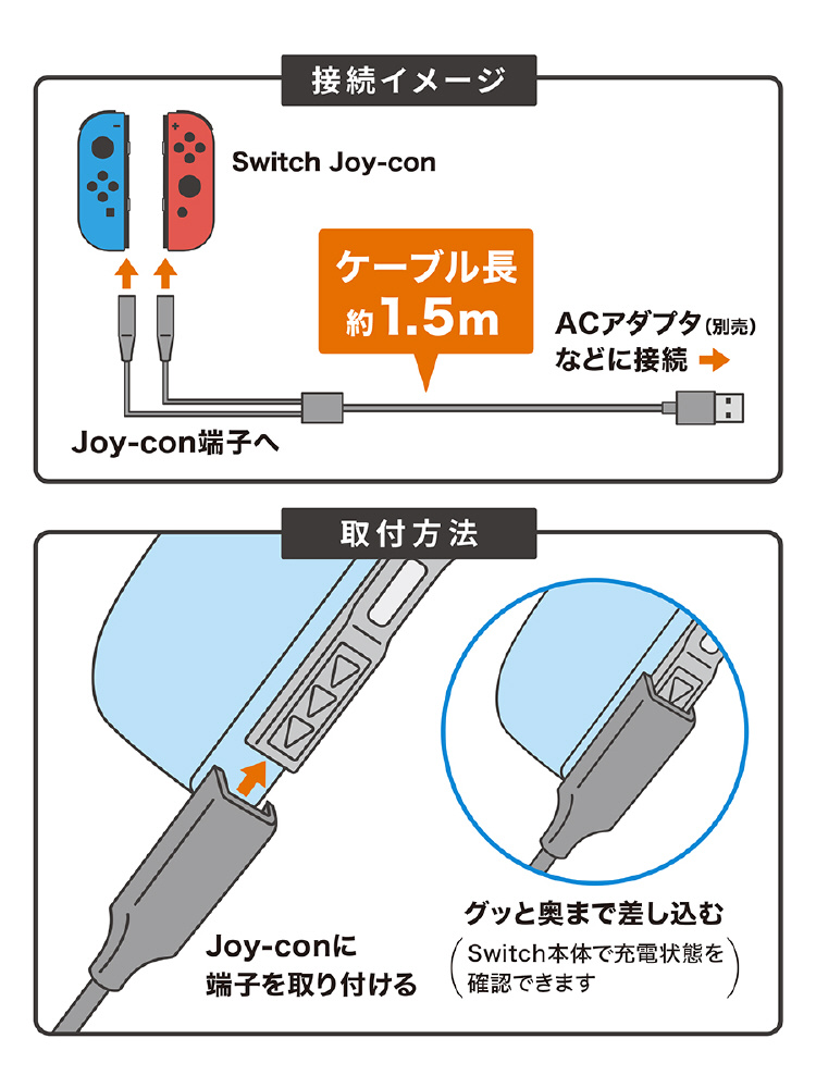 専用のUSB充電ケーブルは、Joy-Conを左右に離した状態のまま、それぞれを充電することが可能。