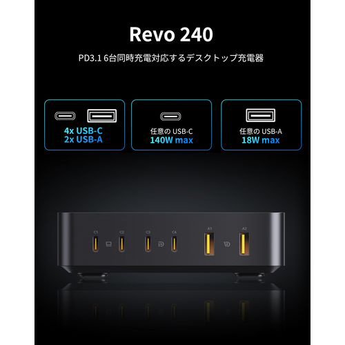 Revo 240 240W高出力 TypeC 4ポート ・USB-A 2ポート 充電器 [6ポート]